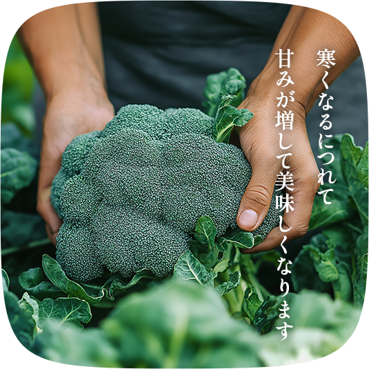 ブロッコリーは、β-カロテン・各種ビタミン類や、食物繊維などを豊富に含んでいることから『万能野菜』といわれます。寒くなるにつれて甘みが増すため、10~3月までが旬の時季。